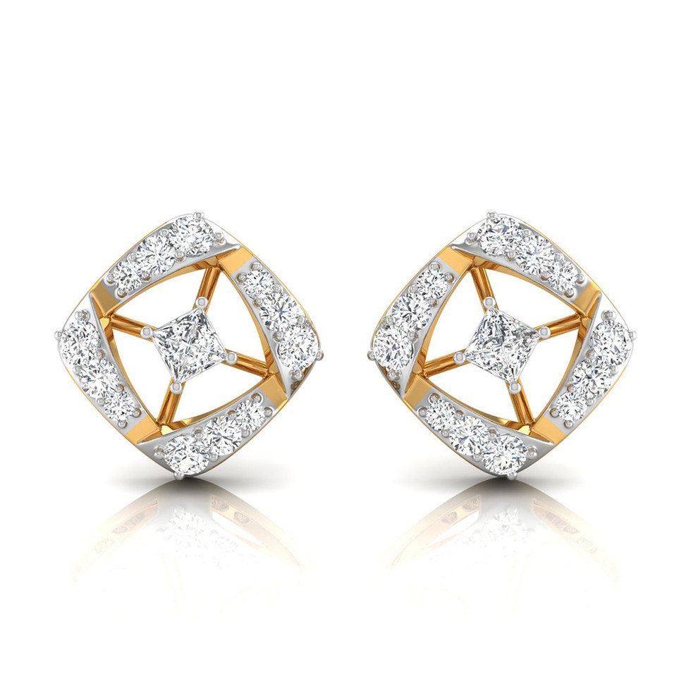 Elevate your elegance with these exquisite 18K Gauri Earrings from Gauri Jewellers. Designed in a modern triangular frame, each earring features a graceful arrangement of sparkling round-cut and pear-shaped diamonds, delicately set in a dual bar structure. The warm glow of 18-karat yellow gold beautifully complements the brilliance of the diamonds, making this pair a perfect harmony of contemporary charm and timeless luxury.
