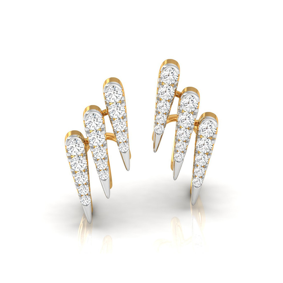 Elevate your elegance with these exquisite 18K Gauri Earrings from Gauri Jewellers. Designed in a modern triangular frame, each earring features a graceful arrangement of sparkling round-cut and pear-shaped diamonds, delicately set in a dual bar structure. The warm glow of 18-karat yellow gold beautifully complements the brilliance of the diamonds, making this pair a perfect harmony of contemporary charm and timeless luxury.